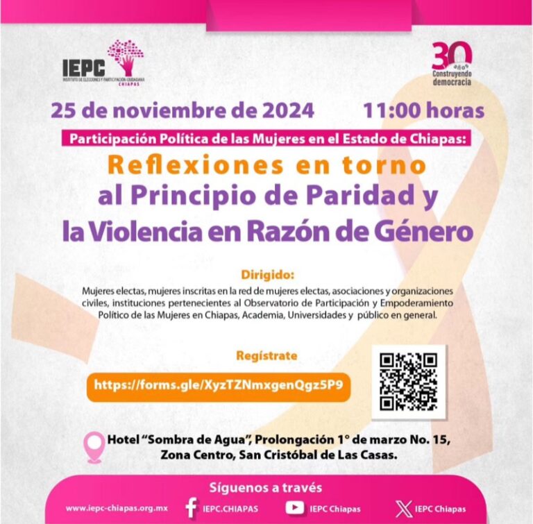 En el marco del Día Internacional de la Eliminación de la Violencia contra la Mujer, el Instituto de Elecciones y Participación Ciudadana (IEPC) de Chiapas llevará a cabo el evento “Reflexiones en torno al Principio de Paridad y la Violencia en Razón de Género” el próximo 25 de noviembre de 2024, a las 11:00 horas.