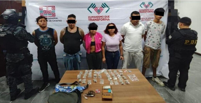 En seguimiento a los trabajos de combate al narcomenudeo en la zona metropolitana, la Fiscalía General del Estado, la Secretaría de Seguridad del Pueblo y la Fuerza de Reacción Inmediata Pakal, realizaron la detención de los imputados en la colonia Terán, quienes de acuerdo a una inspección corporal, les fueron decomisadas 30 bolsitas de marihuana, 2 de cocaína y 5 con metanfetamina (cristal).