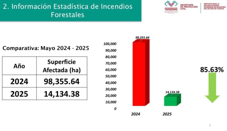 Tuxtla Gutiérrez, Chiapas.- El Centro Estatal de Manejo de Fuego informa que, durante el periodo de enero a abril de 2025, en el estado de Chiapas se han registrado 93 incendios forestales con 14 mil 134 hectáreas afectadas; mientras que en el mismo periodo del año 2024 se registró una superficie afectada de 98 mil 355.64 hectáreas, lo que representa una reducción de 85.63 por ciento.