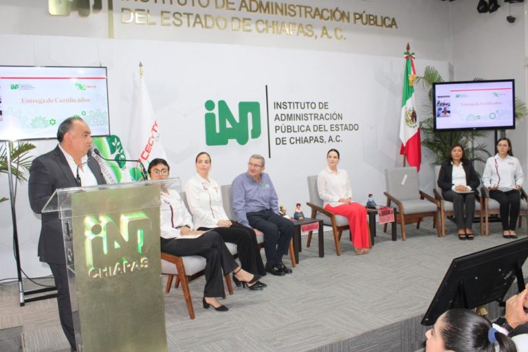 Tuxtla Gutiérrez, Chiapas; viernes 20 de enero de 2023.- El presidente del Instituto de Administración Pública, Dr. Fernando Álvarez Simán, acompañado del Lic. Yonathan León Nájera, Director de Promoción y Apoyo a Prestadores de Servicios, en representación del Mtro. Rodrigo Alejandro Rojas Navarrete, Director del Consejo y Certificación de Competencias Laborales (CONOCER), la C.P. María Mandiola Totoricaguena, secretaria de Igualdad de Género y el Lic. Sandro Hernández Piñón, Director General del Colegio de Estudios Científicos y Tecnológicos y Coordinador Estatal de los Telebachilleratos Comunitarios, entregaron 13 certificados en el estándar: «EC0308: Capacitación Presencial a Servidoras y Servidores Públicos en y Desde el Enfoque de Igualdad Entre Mujeres y Hombres. Nivel Básico”, a personal administrativo.