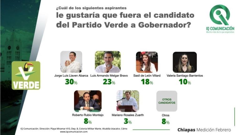 El diputado federal Jorge, Luis Llaven Abarca, escaló a 30% de preferencias para abanderar la candidatura del PVEM, quien tiene una tendencia ascendente, dejando atrás a su compañero de bancada, Luis Armando Melgar Bravo, que solamente obtuvo un 23% de intención.