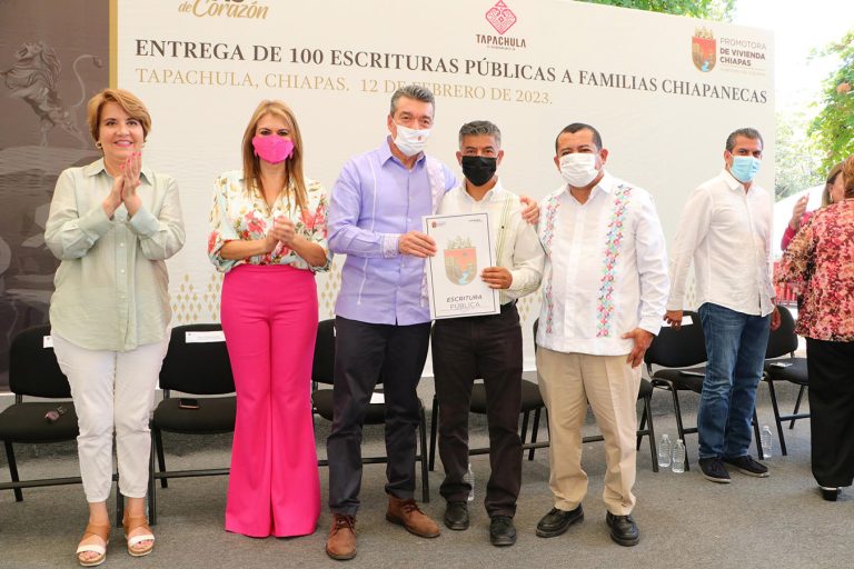 El director general de la Promotora de Vivienda Chiapas (Provich), Freddy Escobar Sánchez, informó que siguiendo las indicaciones del mandatario estatal y tras el trabajo conjunto con los Ayuntamientos de la región, tras muchos años de espera 100 familias recibieron de las manos del gobernador las escrituras públicas que dan certeza jurídica de su vivienda o propiedad. Refrendó su compromiso de seguir impulsando acciones para que más familias regresen a sus casas con la seguridad de que nadie les pueda despojar de su patrimonio.