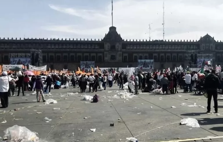 En la zona bajo el asta bandera quedó un amplio espacio vacío repleto de cajas de lonches, basura, carteles con la imagen presidencial, banderines y restos de fruta. “Ya vámonos”, se escuchaba entre los grupos que, mientras contaban sus pertenencias, se retiraban rumbo a los camiones que los transportarían de regreso.