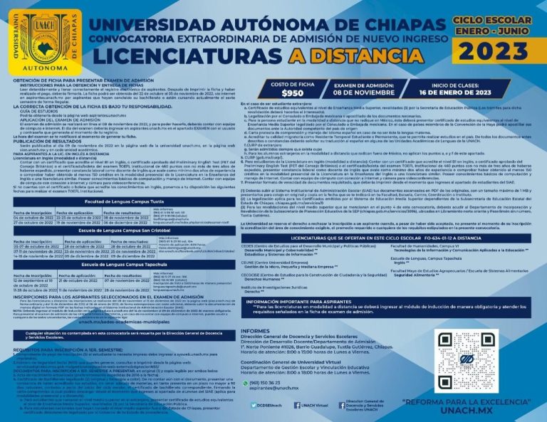 Para mayores informes, los interesados podrán acudir a la Coordinación General de Universidad Virtual o a la Dirección General de Docencias y Servicios Escolares, ubicada en la 1ª Norte Poniente #1026, Barrio de Guadalupe de Tuxtla Gutiérrez, también pueden comunicarse al 961 150 36 23, o mediante el correo electrónico aspirantes@unach.mx.