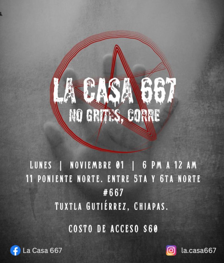 Cabe mencionar que La Casa 667 sólo abrirá sus puertas ese dia en Tuxtla, así que los sólo tendrán una tarde para experimentar esta horrífica experiencia. Además, al final del recorrido podrán adquirir la foto oficial en un set ambientado para que se lleven a casa la imagen del recuerdo del terror.