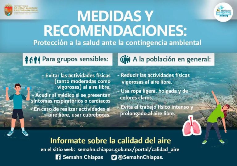 En cuanto a las medidas y recomendaciones a la población durante las siguientes horas, por la protección a la salud, se pide a las personas sensibles no realizar actividades al aire libre. Acudir al médico si se presentan síntomas respiratorios o cardíacos. A la población en general, evitar las actividades físicas moderadas y vigorosas al aire libre; además de mantenerse atentos e informados sobre la calidad del aire en el sitio web semahn.chiapas.gob.mx/portal/calidad aire, Semahn Chiapas en Facebook, en Twitter @SemahnChiapas.