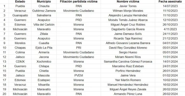 Con los asesinatos de Miguel Ángel Zavala y Armando Pérez Luna, suman 20 candidatos y aspirantes a cargos políticos asesinados. Esto, previo a que formalmente inicien las campañas electorales, las cuales se llevarán a cabo del 1 de marzo al 29 de mayo de 2024.