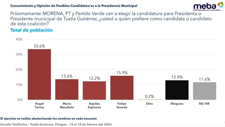 La prestigiosa empresa Mendoza Blanco & Asociados (Meba), da el gane con 33.6% a Ángel Torres, para la candidatura a la presidencia municipal de Tuxtla Gutiérrez, así lo dio a conocer en su página oficial https://mendozablanco.com.mx/