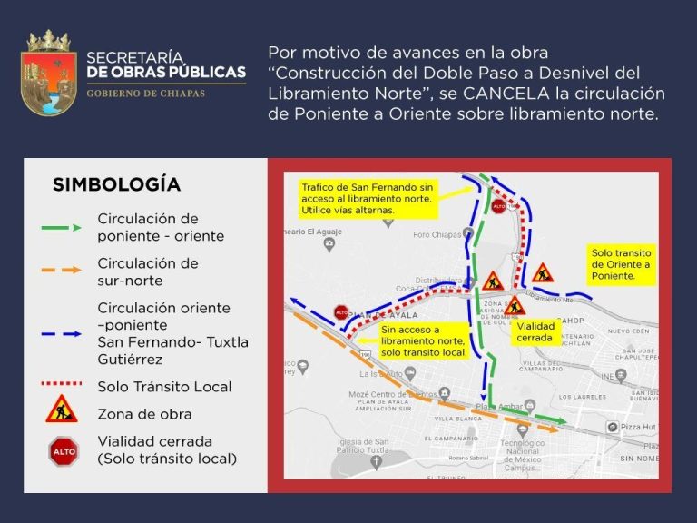 La Secretaría de Obras Públicas del Estado, a cargo de Ángel Torres, informó que, por motivo del avance del Doble Paso a Desnivel del Libramiento Norte Poniente, en Tuxtla Gutiérrez, se cerrará la circulación vial del carril de poniente a oriente, a partir del lunes 24 de octubre.