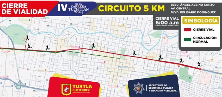 El cierre vial en el punto de arranque de la carrera, ubicado en el cruce del Boulevard Ángel Albino Corzo y la Calzada Samuel León Brindis, comenzará el sábado 24 de agosto a las 10:00 p.m. y se mantendrá hasta las 9:00 a.m. del domingo 25 de agosto.
