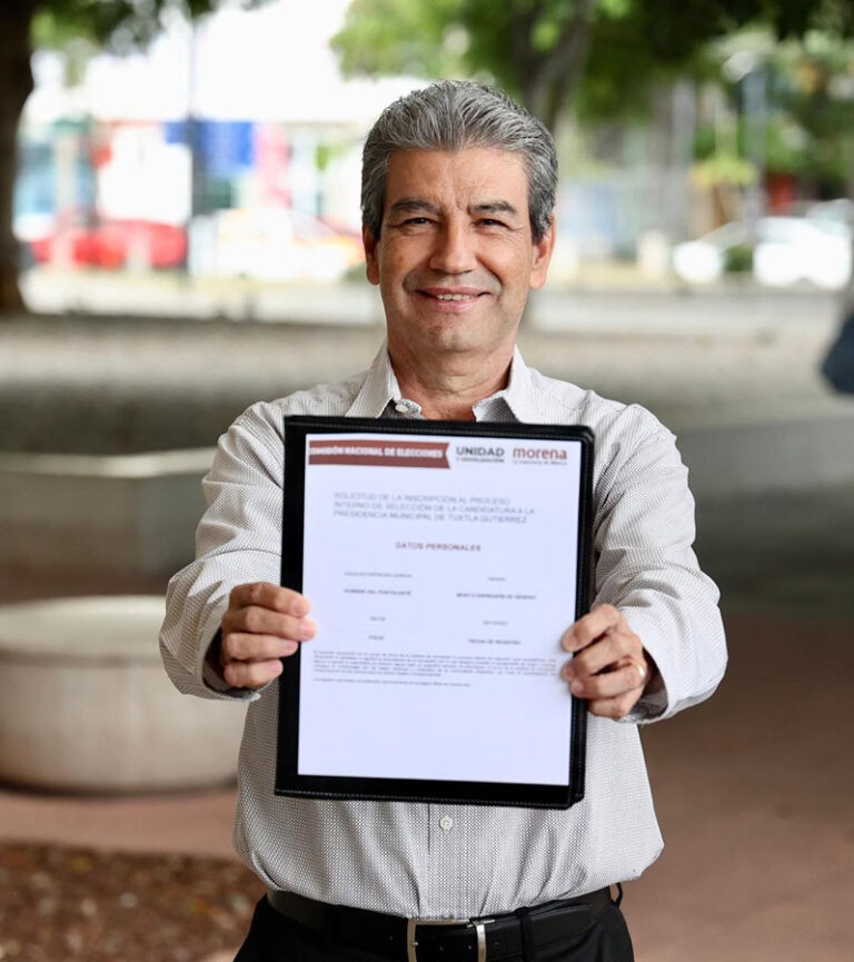 Aquiles Espinosa, aspirante a la coordinación de la defensa de la 4T en la capital de Chiapas, se inscribió el lunes al proceso de selección de Morena de la candidatura a la presidencia municipal de Tuxtla Gutiérrez.