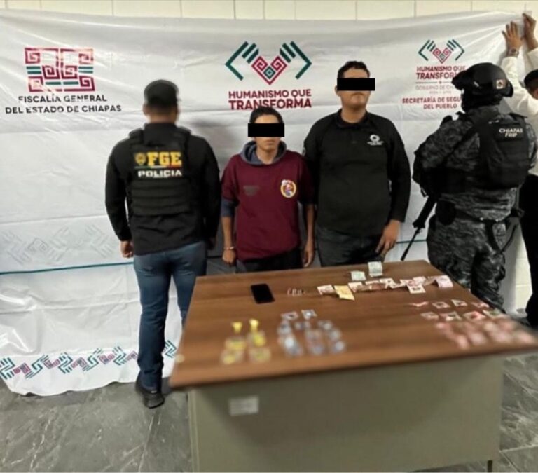 Tuxtla Gutiérrez, Chiapas.- En un trabajo coordinado la Secretaría de Seguridad del Pueblo (SSP), la Fuerza de Reacción Inmediata Pakal (FRIP), la Policía de Investigación (PDI), la Fiscalía General del Estado (FGE), la Secretaría de Seguridad y Protección Ciudadana (SSPC) y la Comisión Nacional Antisecuestros (CONASE); lograron la detención, Luis Fernando “N” de 19 años y Victor Manuel “N” de 24 años, por su presunta participación en el delito contra la salud en su modalidad de posesión con fines de comercio en agravio de la sociedad, también conocido como narcomenudeo.