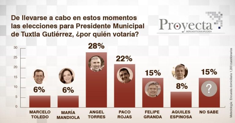 Ángel Torres se mantiene en la delantera en las preferencias electorales como aspirante a la candidatura para presidente municipal de Tuxtla Gutiérrez, de acuerdo con los resultados de la empresa encuestadora Proyecta Mercadotecnia Aplicada.