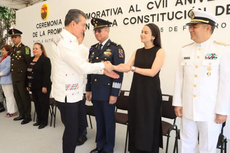 Tuxtla Gutiérrez, Chiapas – En el marco de la ceremonia conmemorativa del CVII aniversario de la promulgación de la Constitución Mexicana de 1917, la Diputada Flor Esponda, en su calidad de Presidenta de la Junta de Coordinación Política de la 68 Legislatura del Congreso Local de Chiapas, se unió a la Presidenta de la Mesa Directiva, la Diputada Sonia Catalina, para rendir homenaje a este pilar fundamental de nuestra historia constitucional, evento encabezado por el Gobernador de Chiapas Rutilio Escandón Cadenas.