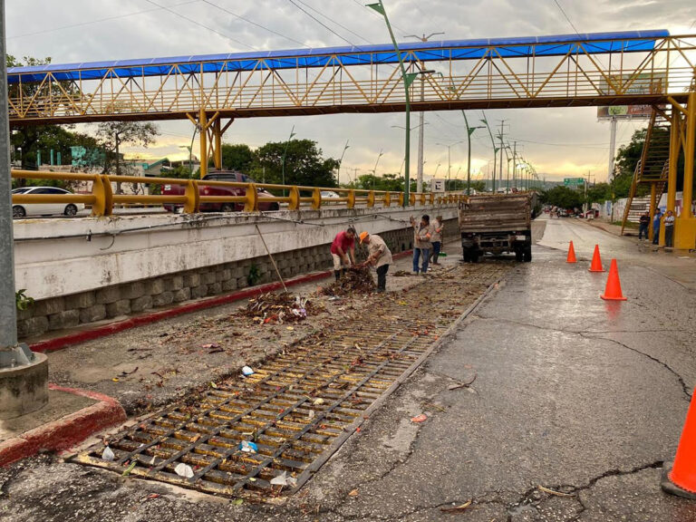 Por su parte, personal de la Secretaría de Obras Públicas Municipales realizó labores de desazolve en la rejilla pluvial ubicada en el Libramiento Norte, esquina con Rosa del Oriente, con el objetivo de liberar el paso del agua, prevenir encharcamientos y mejorar la circulación vehicular en la zona.