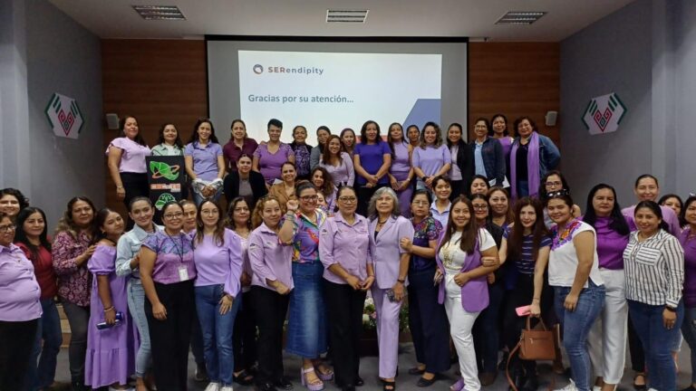 Como parte del evento, Ollinca Villanueva Hernández, de la consultoría SERendipity, impartió una conferencia sobre empoderamiento femenino y, en un acto simbólico, las y los asistentes plasmaron su mano con pintura morada en un moño como muestra de compromiso con la igualdad de género.