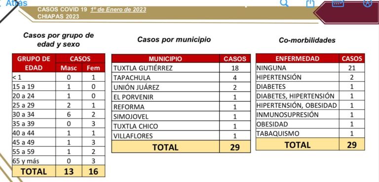 Tuxtla Gutiérrez, Chiapas; 01 de enero de 2023.- Chiapas inicia el año 2023 con 29 casos nuevos de COVID-19, sin ninguna defunción.