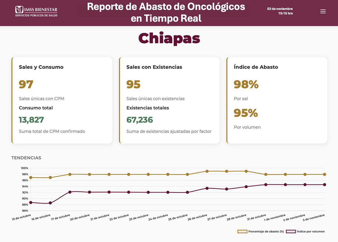 Precisó que esta cifra corresponde al último Reporte de Abasto de Oncológicos emitido por la federación al 3 de noviembre del presente año.