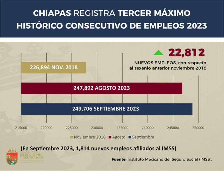 Durante el mes de septiembre del presente ejercicio 2023, Chiapas registró por tercera ocasión consecutiva un nuevo máximo histórico en generación de empleos, con un número de 249 mil 706 trabajadoras y trabajadores afiliados al Instituto Mexicano del Seguro Social (IMSS), informó el secretario de Economía y del Trabajo (SEyT), Carlos Salazar Estrada.