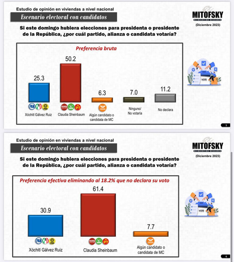En la preferencia efectiva (que elimina a los que no declaran el sentido de su voto), Sheinbaum tiene más del doble en comparación con su oponente Xóchitl Gálvez, con un registro de 61.4 puntos contra 30.9 puntos, respectivamente. Asimismo, la proporción de dos a uno se registra en preferencia bruta.