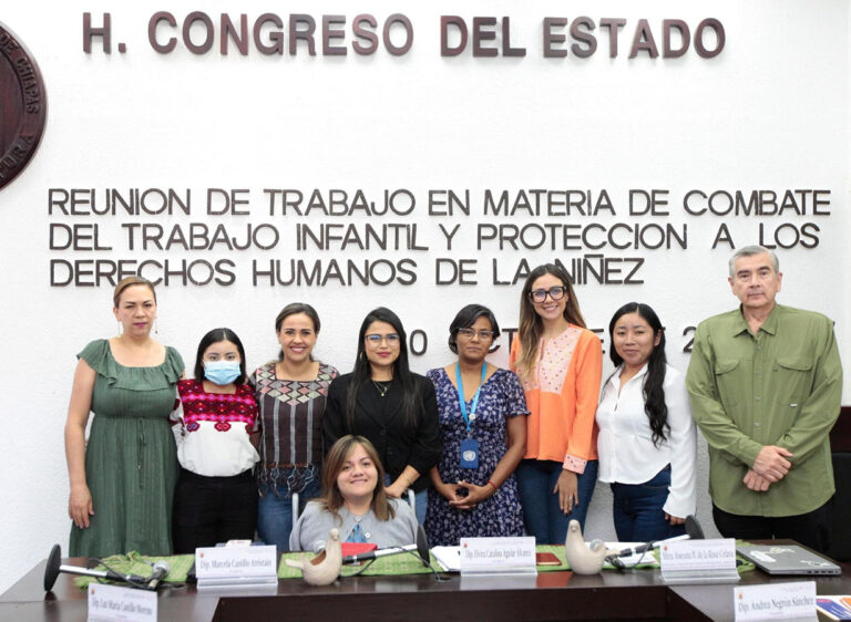 Las y los diputados Elvira Catalina Aguiar Álvarez, Marcela Castillo Atristain, Andrea Negrón Sánchez, José Angel del Valle Molina, Bertha Flores Sánchez, María Isabel Rodríguez Jiménez y Luz María Castillo Moreno, presidentes de las comisiones de Desarrollo Social y Seguimiento al Cumplimiento de los Objetivos de Desarrollo Sostenible; de Planeación para el Desarrollo; de Trabajo, Previsión Social y Seguridad Social; de Economía, Bienestar Social y Cooperación Internacional; Derechos Humanos; de Atención a la Mujer y a la Niñez; de Atención a Grupos en Situación de Vulnerabilidad e Inclusión, analizaron el tema en conjunto con la maestra José Ana de la Rosa Celaya, oficial enlace en Chiapas del Proyecto Accionar de la oficina para México y Cuba de la OIT.