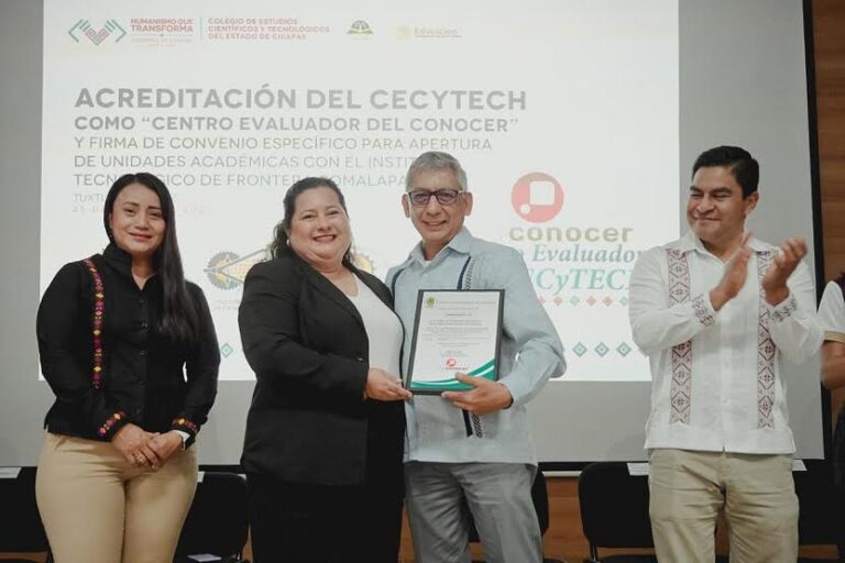 Tuxtla Gutiérrez, Chiapas.- El Colegio de Estudios Científicos y Tecnológicos del Estado de Chiapas (Cecytech) fue acreditado como Centro Evaluador del CONOCER por el Tecnológico Nacional de México (TecNM), Campus Tapachula, y firmó un Convenio Específico de Colaboración con el TecNM, campus Frontera Comalapa, que permitirá establecer nuevas unidades académicas en zonas estratégicas del estado, fortaleciendo la certificación de competencias y la oferta educativa en Chiapas.