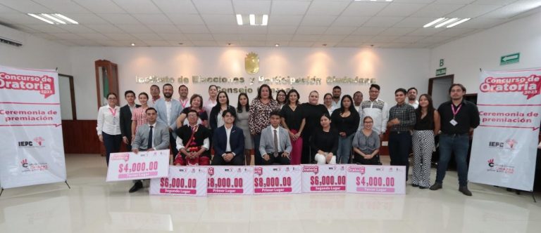 Durante la premiación, realizada este sábado, estuvieron presentes la consejera presidenta provisional, María Magdalena Vila Domínguez, las consejeras electorales Helena Margarita Jiménez Martínez y Teresa de Jesús Alfonso Medina; la titular de la Dirección Ejecutiva de Educación Cívica y Capacitación, Karina Culebro Mandujano; así como personal directivo y operativo de distintas Direcciones y Unidades Técnicas del IEPC.