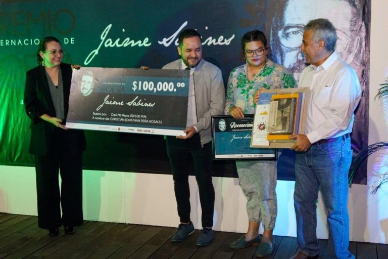 Tuxtla Gutiérrez, Chiapas.- Maritsa Concepción Maranto Zepeda, directora general del Consejo Estatal para las Culturas y las Artes de Chiapas (Coneculta), entregó el Premio Internacional de Poesía Jaime Sabines 2022 a Christian Jonathan Peña Rosales.