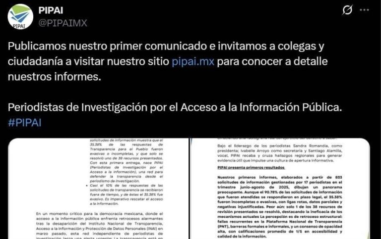 Ciudad de México, 09 OCT.-Periodistas residentes en México anunciaron la creación de la red independiente Periodistas de Investigación por el Acceso a la Información Pública (PIPAI), como un esfuerzo “en un momento crítico para la democracia mexicana, donde el acceso a la información pública enfrenta retrocesos alarmantes” y “tras la desaparición del Instituto Nacional de Transparencia, Acceso a la Información y Protección de Datos Personales (INAI)”.