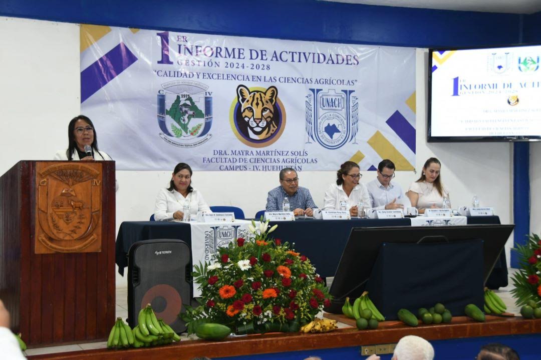 Huehuetán, Chis., 22 OCT.-Rindió su 1er. Informe de Actividades, Gestión 2024-2028, la directora de la Facultad de Ciencias Agrícolas, Campus IV, de la Benemérita Universidad Autónoma de Chiapas, Mayra Martínez Solís, ante los integrantes de la Junta de Gobierno, la comunidad docente y estudiantil de esta unidad académica.