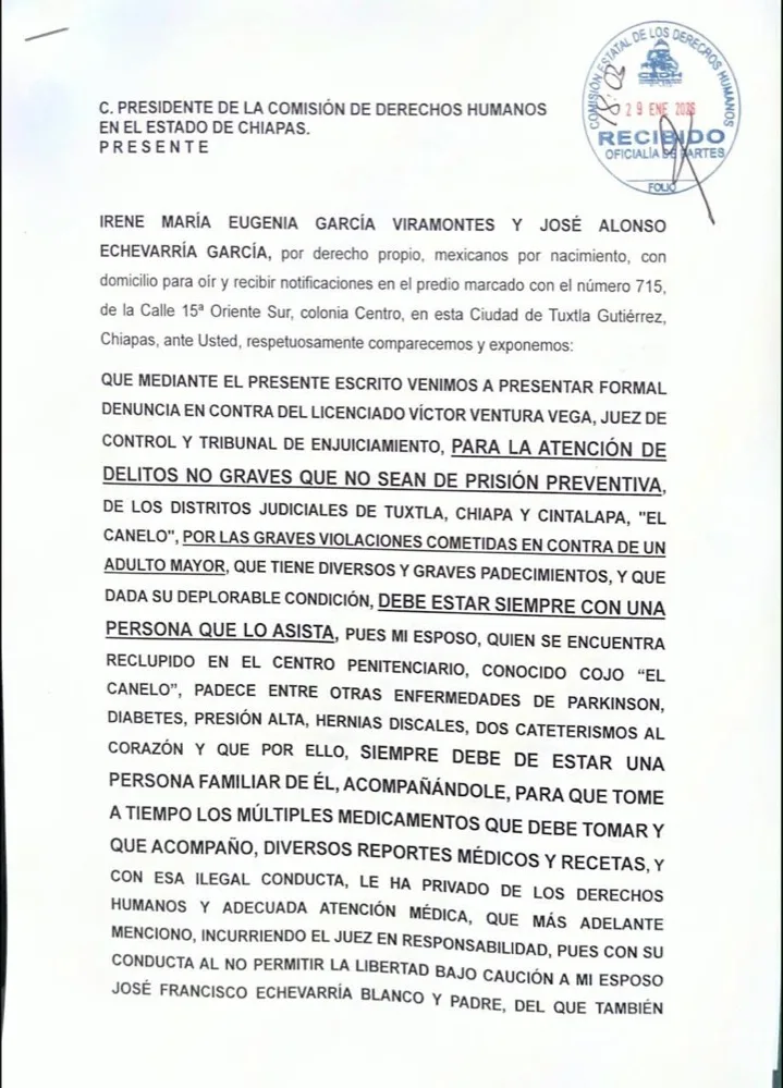 Tuxtla Gutiérrez, Chiapas.— Un caso que podría escalar a una investigación por presuntas violaciones a derechos humanos fue presentado ante la Comisión Estatal de los Derechos Humanos (CEDH), donde familiares de un adulto mayor de 78 años denunciaron al juez de control Víctor V., señalando que su decisión de mantenerlo en prisión estaría poniendo en riesgo su salud y su vida.