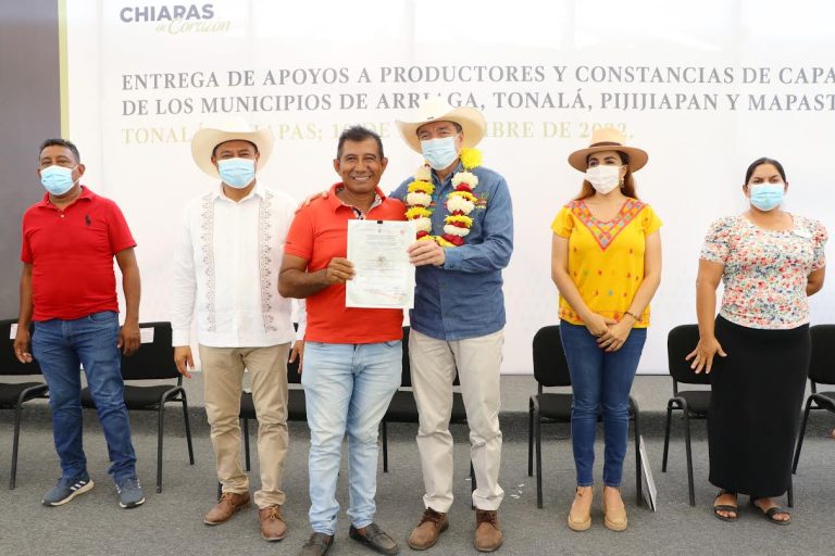 En la costa chiapaneca, el gobernador Rutilio Escandón Cadenas entregó apoyos y constancias de capacitación a integrantes del sector pesquero de los municipios de Arriaga, Tonalá, Pijijiapan y Mapastepec, donde señaló que junto al presidente Andrés Manuel López Obrador, se ha fortalecido el respaldo a las familias pesqueras con mayor capacitación, insumos y recursos.