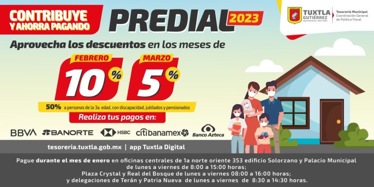 El alcalde de Tuxtla Gutiérrez, Carlos Morales Vázquez, recordó a la ciudadanía que continúa el programa de descuentos para el pago Predial 2023 durante el mes de febrero, con un 10 por ciento, exhortó a no dejar pasar la oportunidad y regularizarse en el mismo.