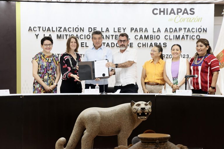 Durante la entrega y presentación de la actualización de la Ley para la Adaptación y Mitigación ante el Cambio Climático en el estado de Chiapas, el gobernador Rutilio Escandón Cadenas resaltó la importancia de no escatimar esfuerzos y hacer causa común entre autoridades y la sociedad civil para atender este reto mundial a favor del cuidado de la madre tierra, porque al hacerlo se contribuye a la protección y conservación de la vida de los seres vivos.