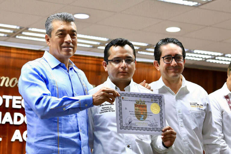 En este marco, el mandatario encabezó la entrega de reconocimientos a participantes del diplomado Aprovechamiento Sustentable del Agua, impartido por la Escuela Nacional de Protección Civil, Campus Universitario Chiapas (Enaproc Chiapas), donde reconoció el compromiso de las y los servidores públicos, profesionistas y representantes de diferentes municipios, de capacitarse en temas que son importantes para el bienestar del pueblo.