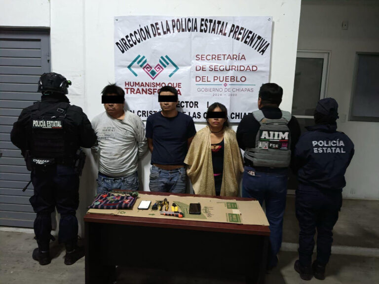 Elementos de la Fiscalía General del Estado y la Secretaría de Seguridad del Pueblo detuvieron a Gabriela “N”, Feliciano “N” y José “N”, como presuntos responsable del delito de robo con violencia agravado (robo vehicular), cometido en agravio de Daniel “N” y Yaneth “N”, por hechos ocurridos en la comunidad de Navenchauc, del municipio de Zinacantán.