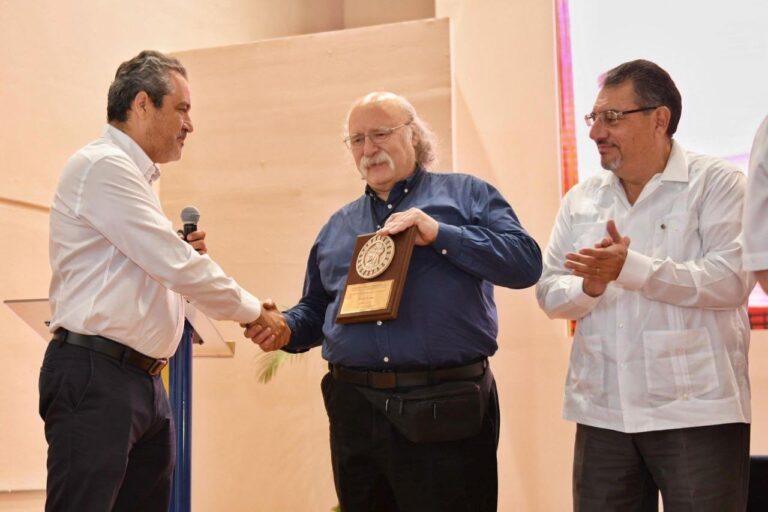 Posteriormente, el rector Carlos Faustino Natarén Nandayapa le entregó un reconocimiento y destacó la importancia de que personalidades como el Premio Nobel puedan interactuar con la comunidad universitaria.