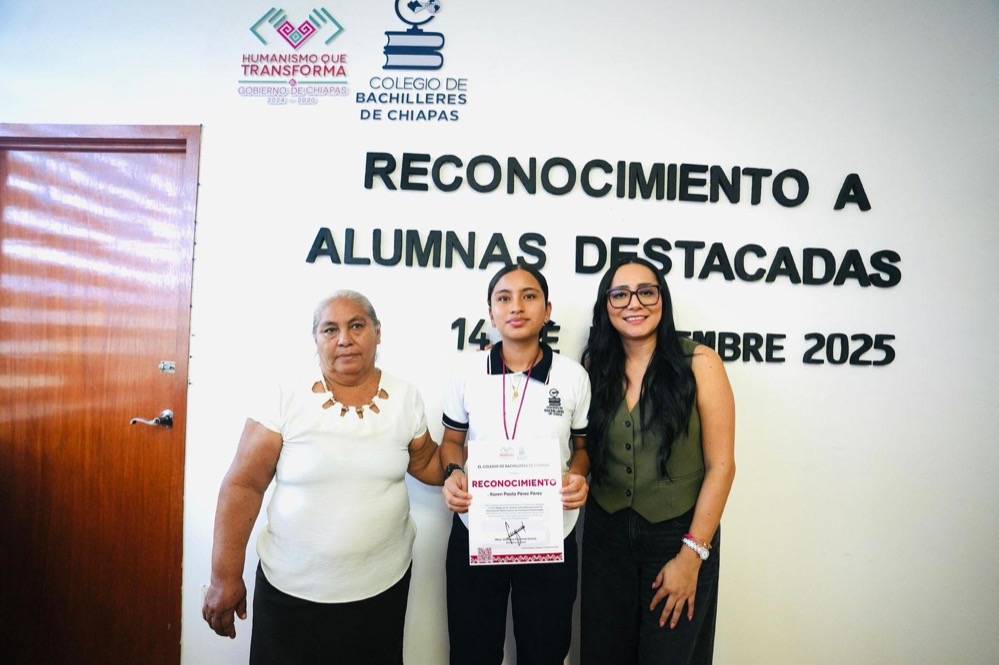 Tuxtla Gutiérrez, Chiapas; 14 de noviembre de 2025.- El talento juvenil volvió a brillar en el Colegio de Bachilleres de Chiapas (Cobach). La directora general de la institución, Viridiana Figueroa García, entregó reconocimientos a dos alumnas que han puesto en alto el nombre del estado gracias a su desempeño sobresaliente en los ámbitos deportivo y académico.