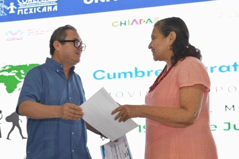 En este sentido, acompañado por la coordinadora General del Centro de Estudios para el Desarrollo Municipal y Políticas Públicas (CEDES), Andrea Mena Álvarez, destacó la trayectoria de quien también es Doctora Honoris Causa de la UNACH, en su lucha constante en pro de los derechos de las mujeres, las infancias y los migrantes.