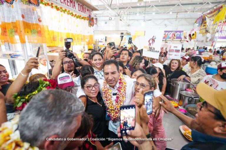 Tuxtla Gutiérrez, Chiapas.- El candidato a la gubernatura del estado, por la coalición “Sigamos Haciendo Historia en Chiapas”, Eduardo Ramírez Aguilar, recorrió el mercado Juan Sabines y visitó a pobladores de la colonia Democrática de Tuxtla Gutiérrez, como parte de su campaña electoral.