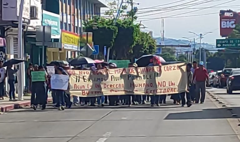 Con pancartas y 25 años de espera a cuestas, habitantes del Ejido Nuevo Bochil, en Chiapa de Corzo, protestaron frente a Palacio de Gobierno para exigir la conclusión de la obra hidráulica que les permita abastecerse de agua.