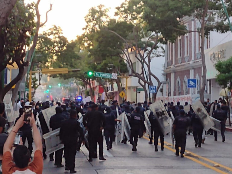 Tuxtla Gutiérrez, Chis., 09 NOV.-Elementos de la Secretaría de Seguridad y Protección Ciudadana del Estado (SSyPC) aplicaron el Protocolo para Restablecer el Orden en el centro de Tuxtla Gutiérrez, donde un grupo de estudiantes de la Escuela Normal Rural Mactumactzá realizó actos vandálicos en la vía pública y en Palacio de Gobierno.