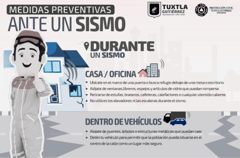 Chiapas ocupa el tercer lugar de sismicidad a nivel nacional, por ello PC Tuxtla Municipal emitió una serie de carteles donde asesora a la población sobre lo que se debe hacer antes, durante y después de un movimiento telúrico.