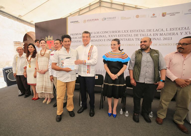 En Chiapa de Corzo, el gobernador Rutilio Escandón Cadenas encabezó la ceremonia de premiación de los concursos estatales de Laca, Máscara Tradicional, Talla en Madera y de Bordado e Indumentaria Tradicional, con lo que se busca reconocer el talento de mujeres y hombres que, a través de las artesanías, hacen que Chiapas se distinga a nivel nacional e internacional.