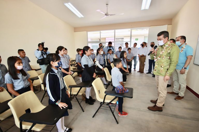En el municipio de Chiapa de Corzo, el gobernador Rutilio Escandón Cadenas inauguró cuatro aulas en la Escuela Primaria “Niños Héroes de Chapultepec”, donde garantizó que se trabaja para que nada haga falta a fin de que la niñez y la juventud puedan sacar adelante sus aspiraciones de desarrollo y progreso a través de la educación.
