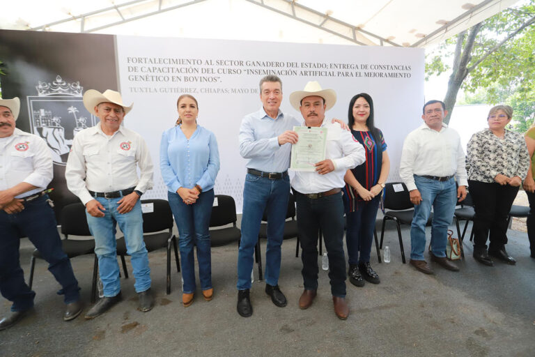 El sector ganadero en Chiapas garantiza la alimentación y genera empleos para la gente, de ahí la importancia de impulsar su capacitación, mencionó el gobernador Rutilio Escandón Cadenas al presenciar la entrega de constancias como parte del curso “Inseminación Artificial para el Mejoramiento Genético de Bovinos”.