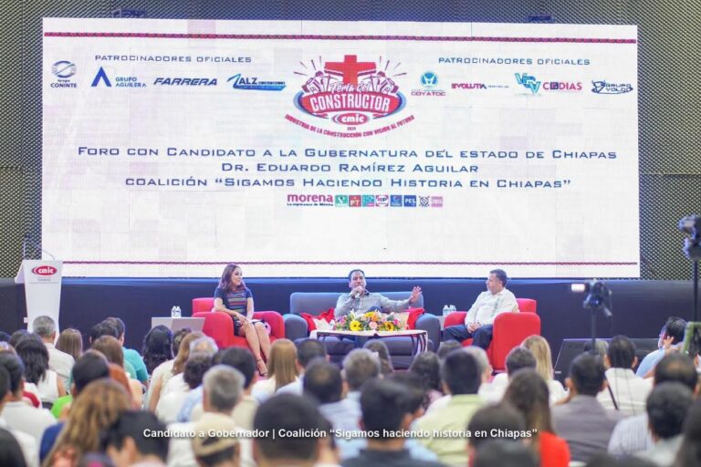 Tuxtla Gutiérrez, Chis., 02 MAY.-El candidato a gobernador por la coalición “Sigamos Haciendo Historia en Chiapas”, Eduardo Ramírez Aguilar, asistió como invitado al “Foro con candidatas y candidato a la gubernatura del estado de Chiapas”, realizado por la Cámara Mexicana de la Industria de la Construcción (CMIC), delegación Chiapas.