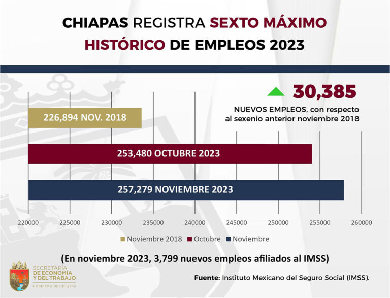 El estado de Chiapas impuso en noviembre pasado el registro de su quinto máximo histórico en generación de empleos de manera consecutiva, y sexto en lo que va del año, logrando así 257 mil 279 afiliados ante el Instituto Mexicano del Seguro Social (IMSS), informó el secretario de Economía y del Trabajo, Carlos Salazar Estrada.