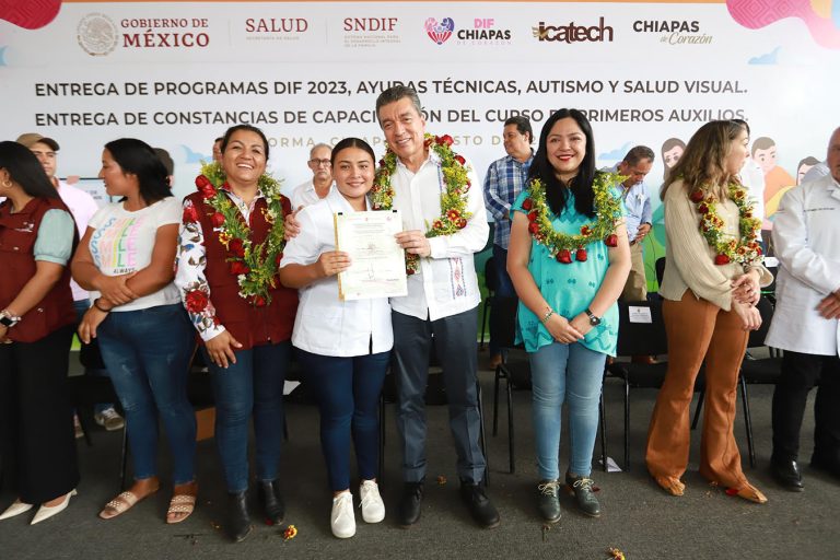 Durante su visita a este municipio, Escandón Cadenas también entregó constancias de capacitación para el empleo y del Curso de Primeros Auxilios, impartido por el Instituto de Capacitación y Vinculación Tecnológica del Estado de Chiapas (Icatech), donde explicó que la meta es incentivar a las y los habitantes a emprender su propio negocio, lo que contribuye a la autosuficiencia económica, así como capacitar a la población y las autoridades con el objetivo de estar mejor preparados para atender cualquier situación de emergencia.
