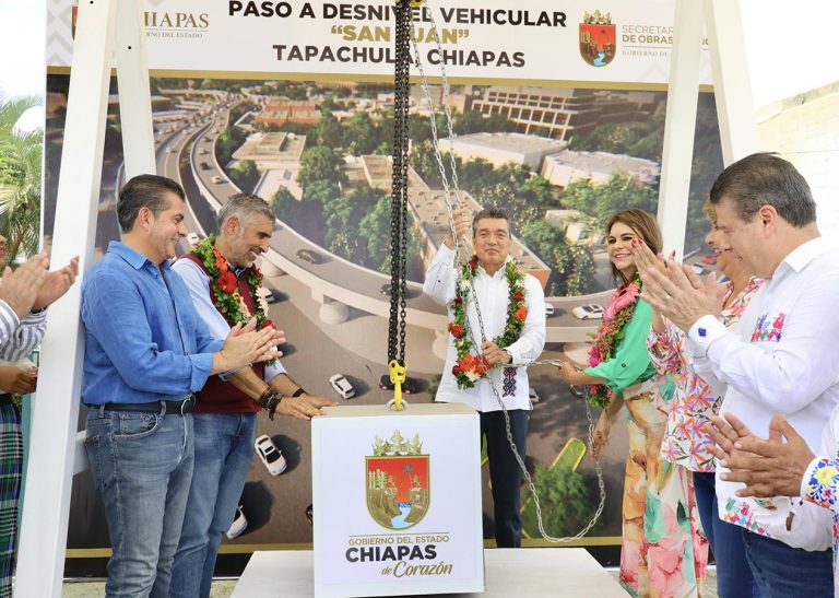 En su gira de trabajo por Tapachula, el gobernador Rutilio Escandón Cadenas colocó la primera piedra del Paso a Desnivel Vehicular San Juan, el cual favorecerá la movilidad tanto de automovilistas como de peatones, y mejorará la imagen urbana, la seguridad y el desarrollo de este municipio.